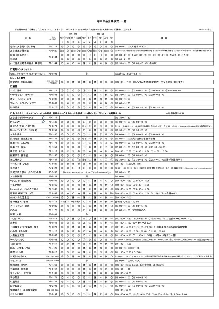 山代温泉の施設及び店舗の営業一覧表です。 ※12/24現在の情報です。今後変更になる事がございます。